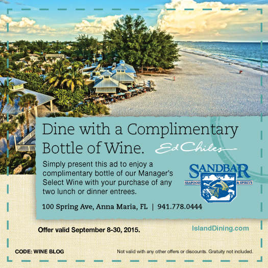 The Sandbar has designated September as the month for free wine! Enjoy a free bottle of manager's select wine anytime you purchase two lunch or dinner entrees!